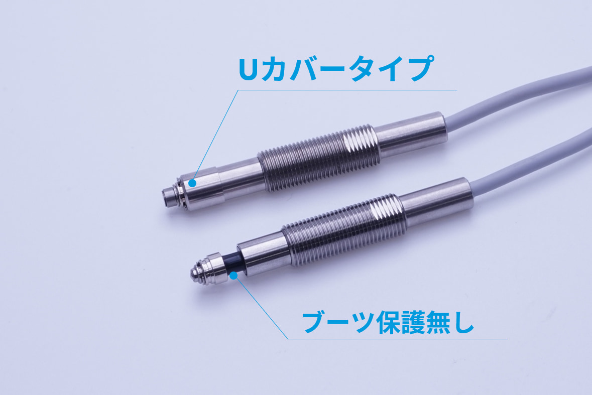 ゴムブーツは通常むき出しの状態のため、切粉など鋭利なものがセンサに触れる環境ではゴムブーツが破損し内部へ液体や粉塵が侵入する恐れがあります。こうしたケースでは「ブーツ保護」オプションの搭載を推奨しています。