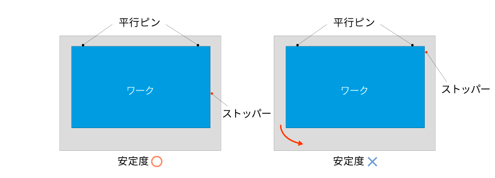 図の左側のように、平行を出している基準面から離れた位置にX軸側のストッパーを設けるとワークが取り付けやすくなり、逆に右側のようにX軸のストッパーが平行の基準面に近すぎると赤い矢印の向きに回転しようとする力が働き、正確に取り付けできなくなる可能性があります。