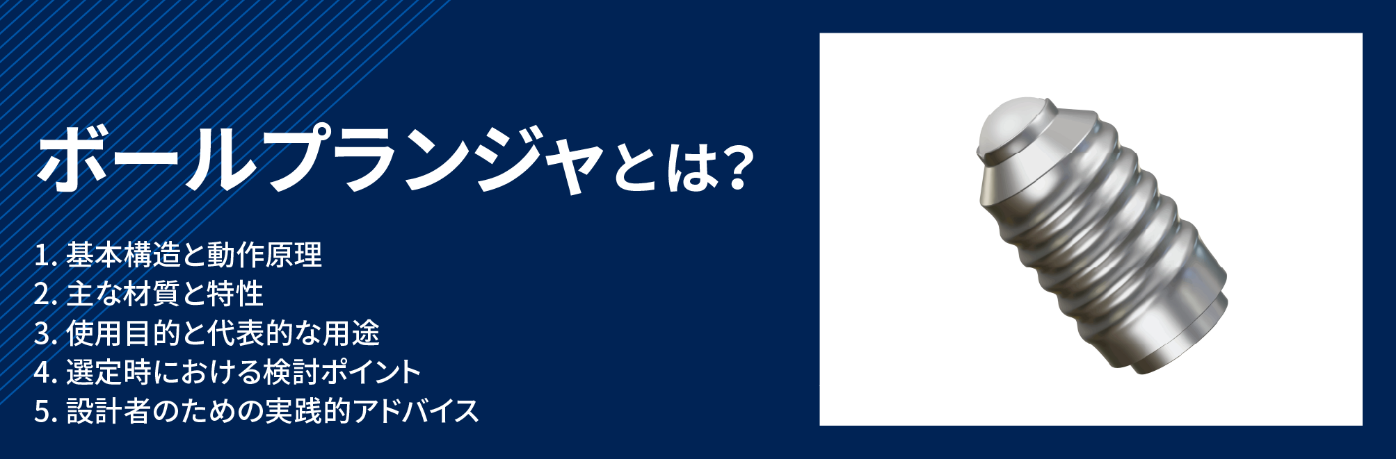 この記事では、ボールプランジャの 基本構造と動作原理、材質ごとの特性、代表的な用途 を整理したうえで、選定時の検討ポイントや設計者の実務的な注意点、現場での応用事例 を具体的に解説します。