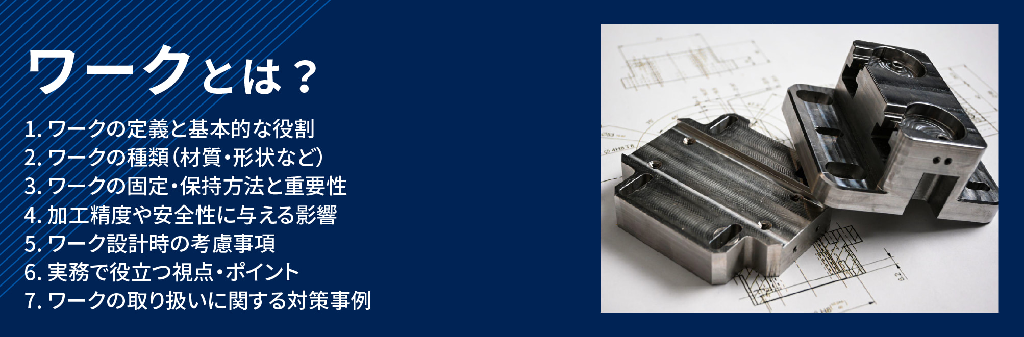 一般に、ワークは最終製品の形状に加工される素材や部品のことで、金属塊や板材などの生素材から必要な形状へ削り出される「加工対象物」です。