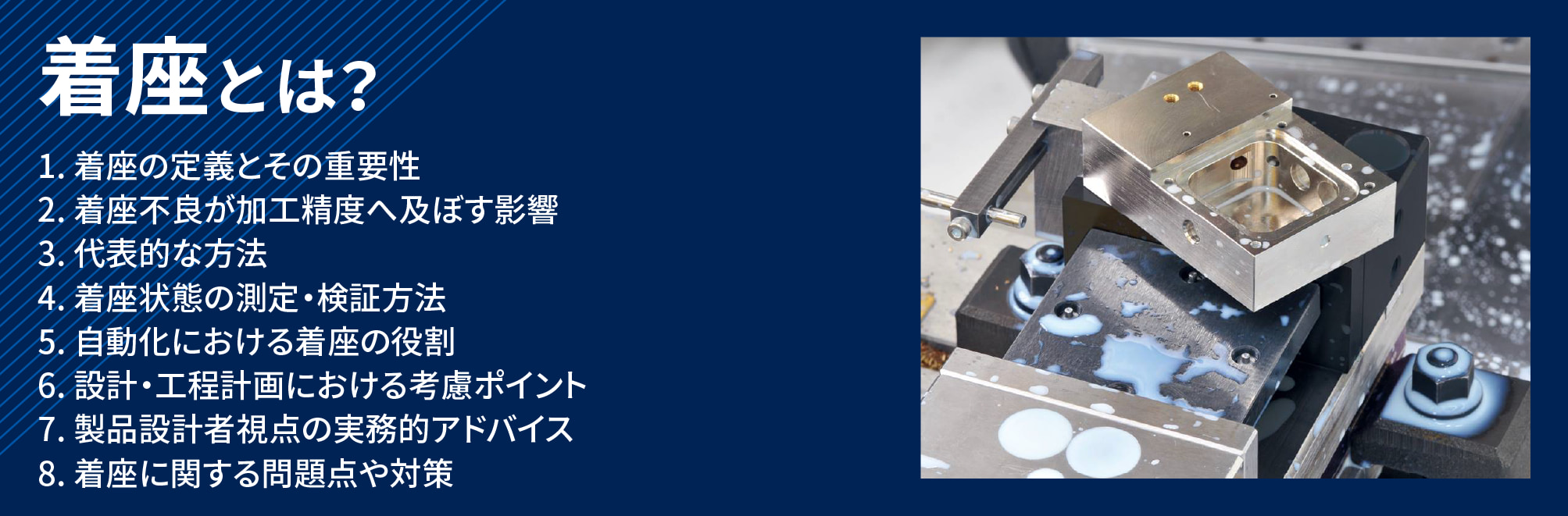 着座とは、ワークを所定の位置・姿勢に正確に固定することを指し、加工の寸法精度・表面粗さ・工具寿命にまで直結する重要な工程です。