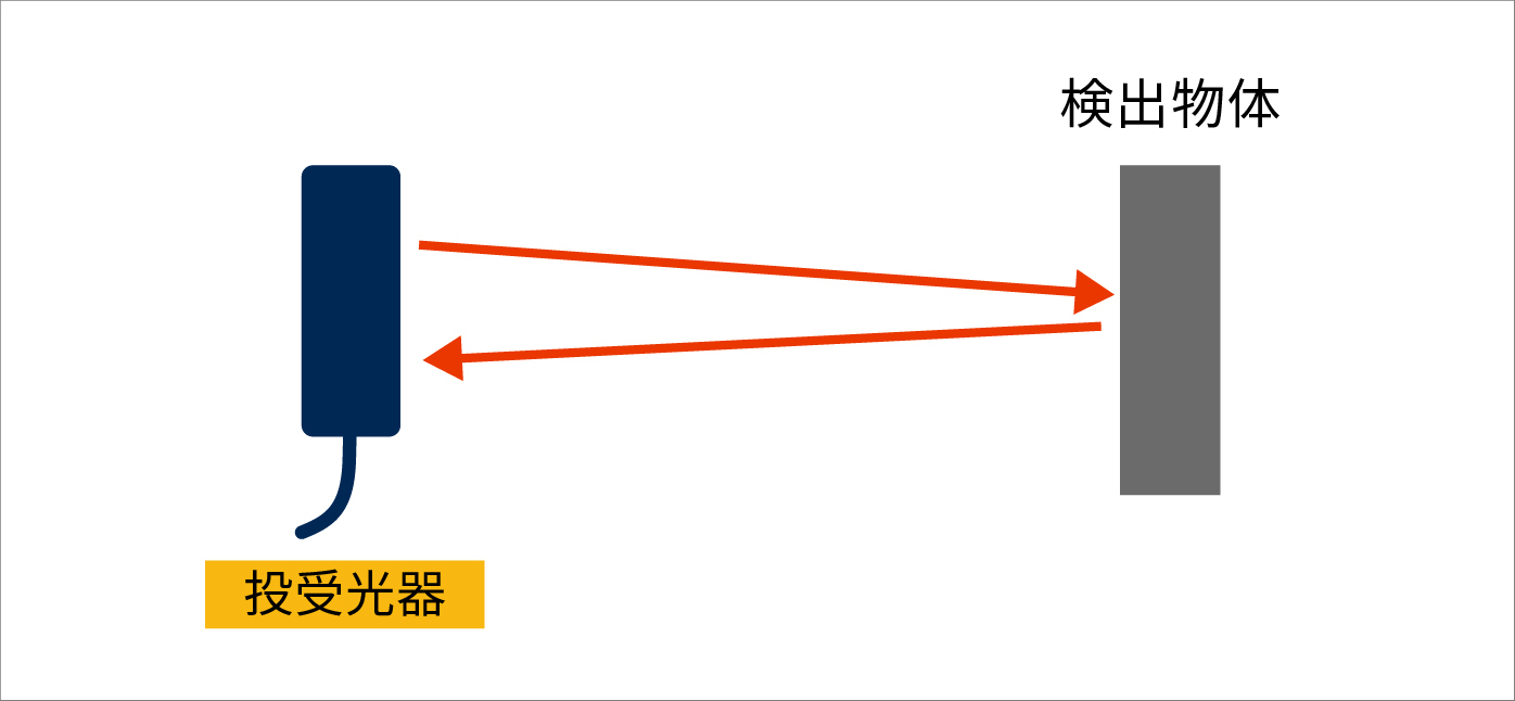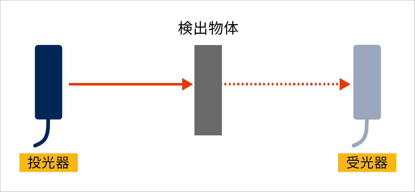 透過型(Through-beam)センサでは、発光器と受光器が対向するように離れて設置され、両者間に張られた光ビームが遮られることで物体を検出します。検出対象が発光部と受光部の間を通過して光を遮ると、受光部に届く光が減少し、その変化をもってスイッチが動作します。