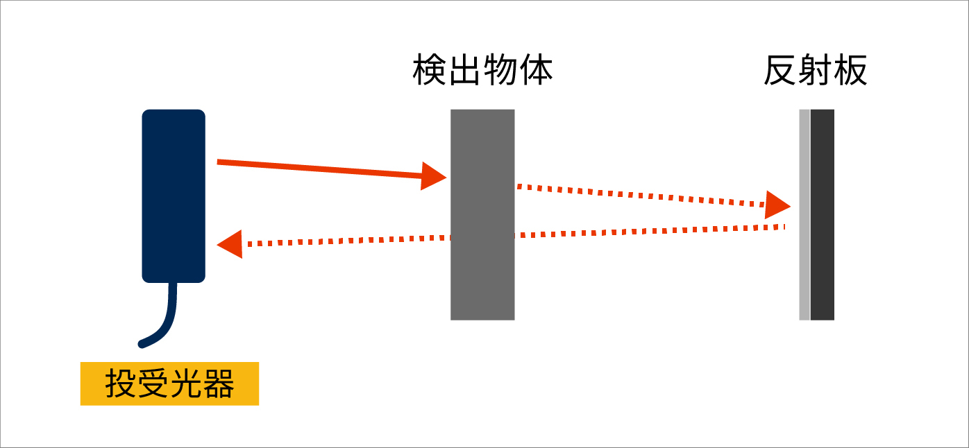検出対象物がセンサと反射板の間に入ると光路を遮り、受光光量の減少によって物体の存在を検知します。透過型のように発光器と受光器を別々に配線する必要がなく片側設置で済む利点があり、検出距離も数メートルから最大10m前後まで比較的長距離の検出が可能です。