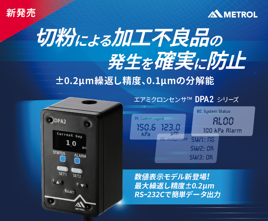 「ワークと治具の密着確認」や「回転砥石の位置決め」を自動化する「DPAシリーズ」に、“数値表示・出力”という新たな機能を搭載した最新モデル『DPA2』が4月より新発売。「トレーサビリティ」や「予知保全」など、従来モデルのOK/NG判定だけでは対応できなかったニーズにお応えいたします。