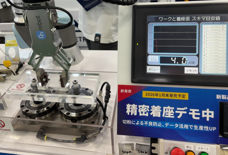 協働ロボットによるワーク自動運搬時の着座確認デモをご用意。測定データのPLC、PC表示事例もご覧頂けます。