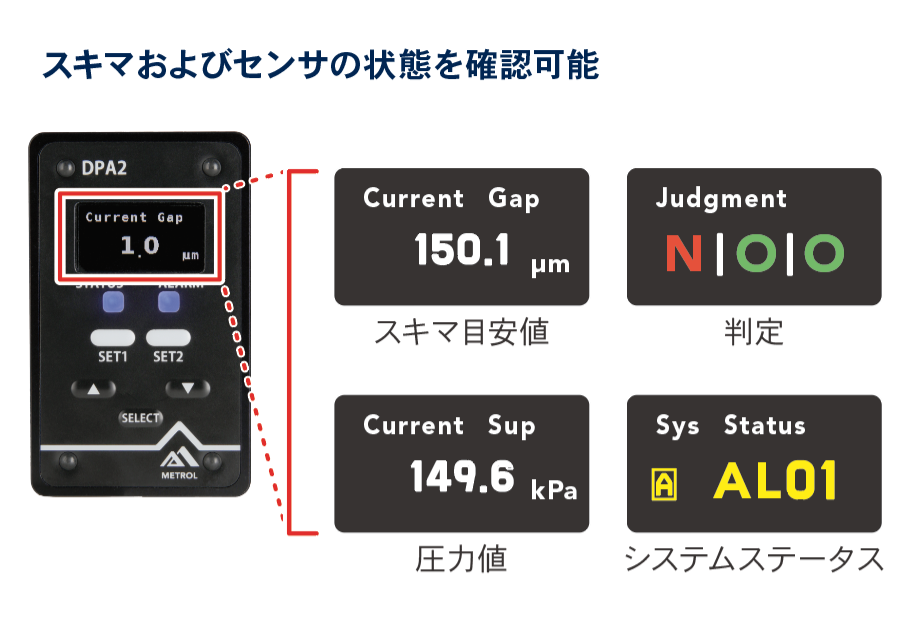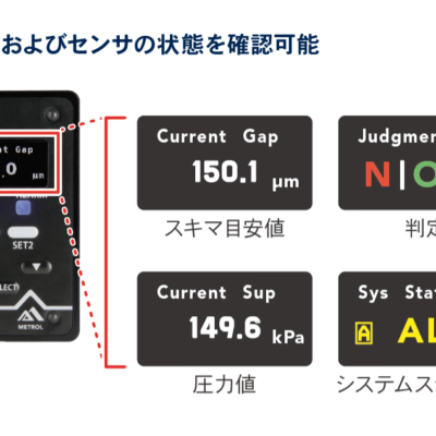 スキマ目安値を0.1μm単位で数値表示でき、RS-232CでPLCやパソコンへ簡単に出力可能。履歴管理やトレーサビリティ強化、予知保全に役立ちます。