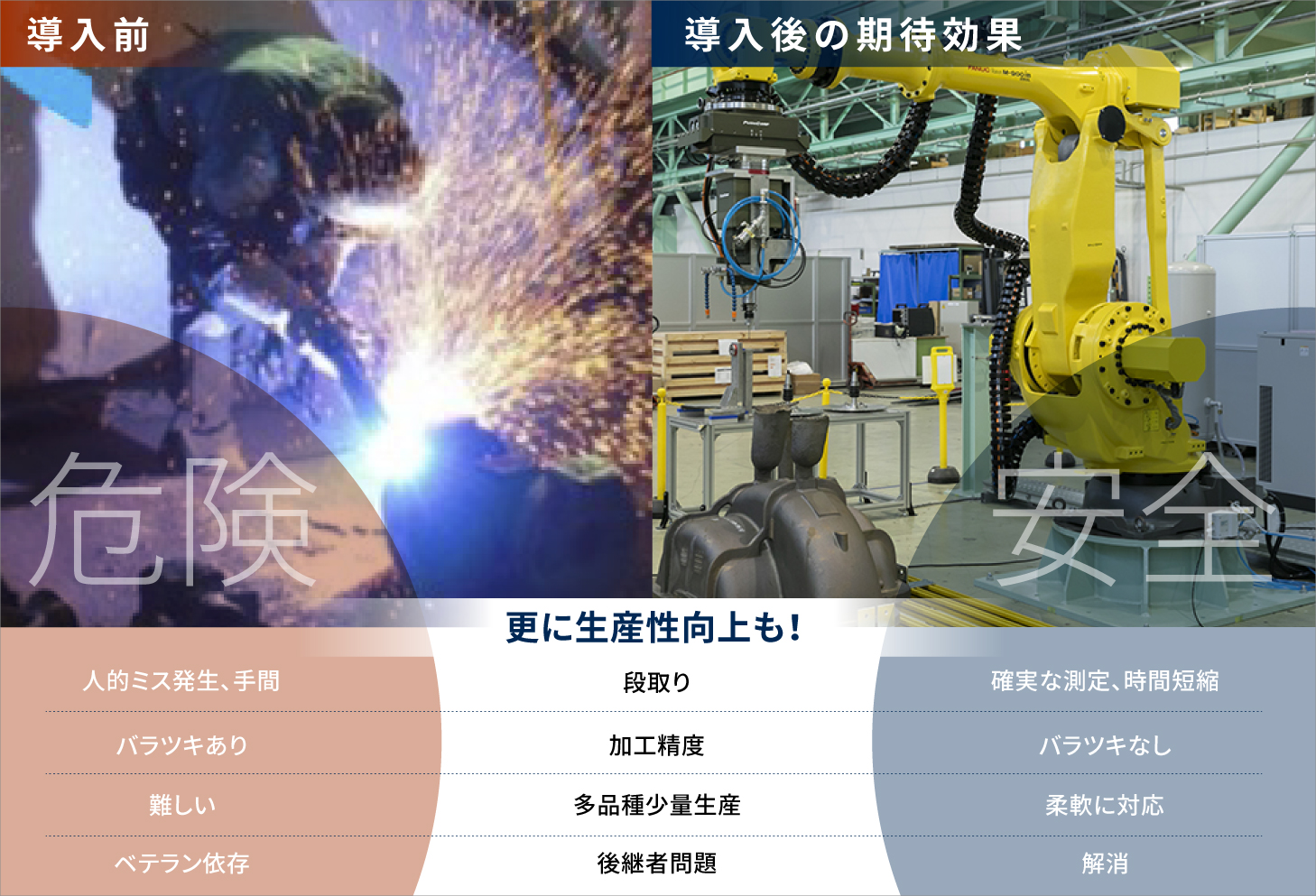 従来の「人が動いて、測って、切断、研磨する」作業が、タッチプローブで位置決め、ロボットで自動切断および研削する工程に変わったのです。
